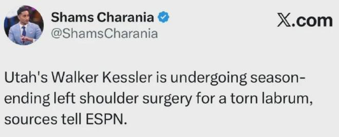 今天据Shams报道,爵士主力中锋凯斯勒遭遇了左肩关节盂唇撕裂,已经选择接受手术,确定赛季报销。