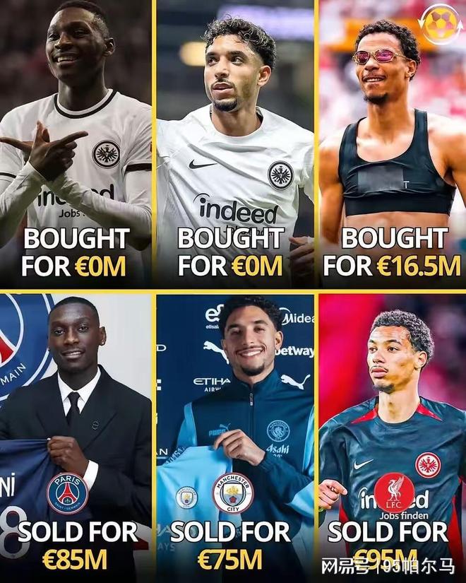 法兰克福属于新势力的“黑店”。2019年约维奇以6300万欧元转会皇马,阿莱以5000万欧元转会西汉姆,2023年穆阿尼以8500万欧加盟巴黎,2025年马尔穆什以7500万欧元加盟曼城,埃基蒂克以9500万欧元加盟利物浦。